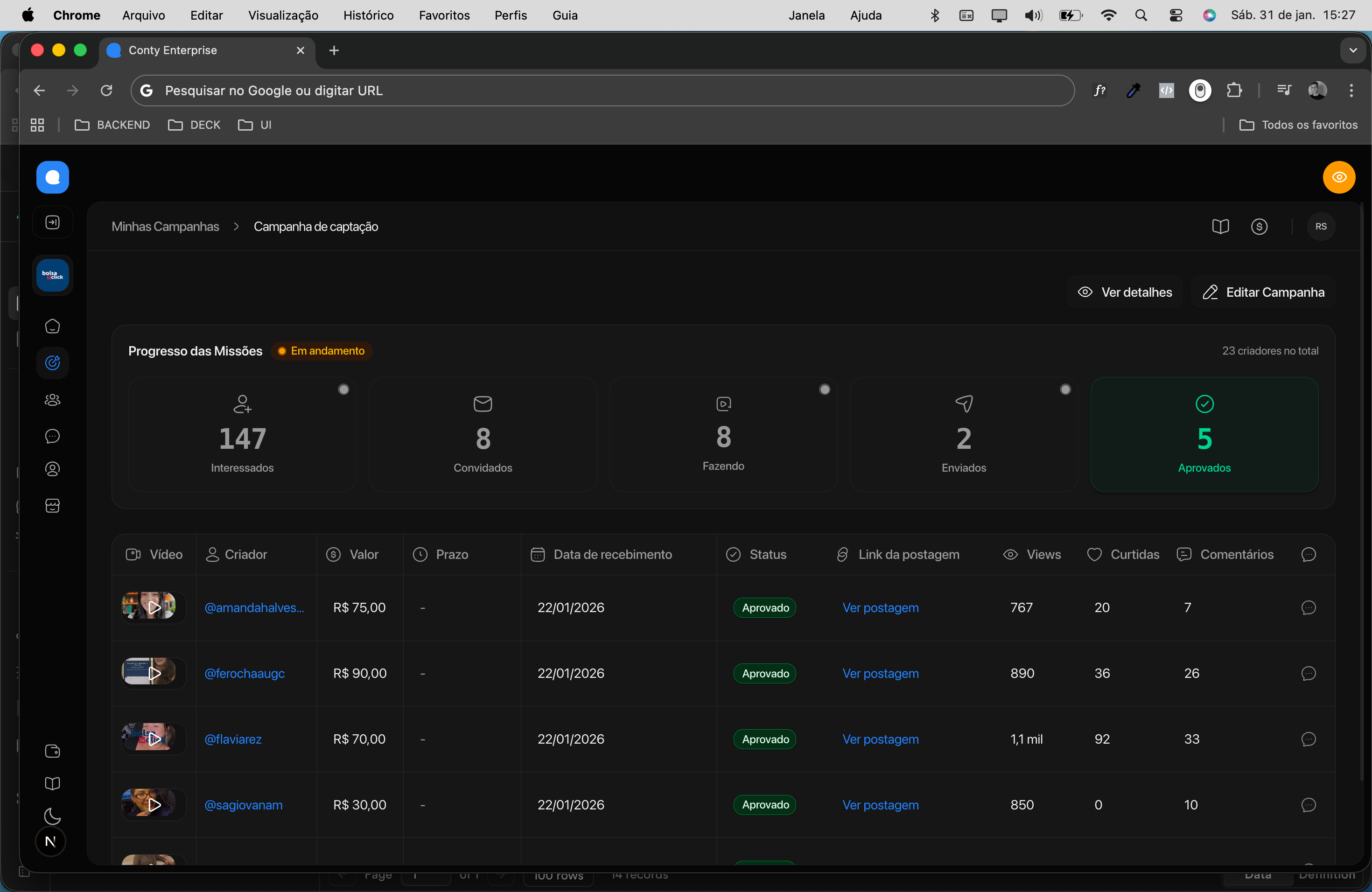 - Adicionadas colunas de Views, Curtidas e Comentários na aba “Aprovados” das campanhas de Reels em Collab
